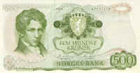 Find Norwegian banknotes and coins on eBay 5th issueThe 5th issue was to replace the rather cumbersome, large notes of the previous issues. In the 5th issue there was no 5 kroner note, the note having been replaced by a coin in 1963. The sizes were gradually larger from 10 to 500 kroner, with the 500 and 1000 the same size. If not exactly colourful by modern standards, at least the 5th issue was more colourful than the 3rd and 4th. The portraits are of the same persons as in the 4th issue, except for Christian Michelsen being dropped and replaced by Fridtjof Nansen (ex-5 kr) on the 10 kr note.